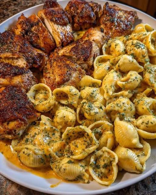 Perfect — this looks like Creamy Garlic Herb Shell Pasta with Juicy Seasoned Chicken.