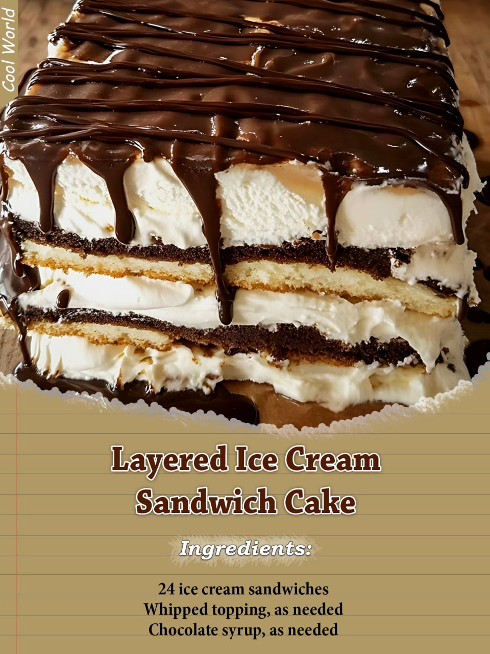 A no-bake frozen dessert made by stacking ice cream sandwiches with layers of whipped topping, chocolate fudge, and crushed candy. It’s creamy, cold, sweet, and incredibly easy — perfect for parties or a quick make-ahead treat.