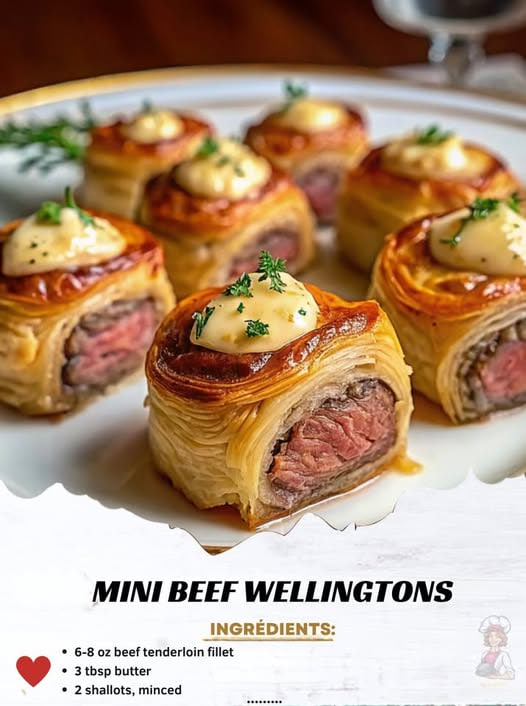 ADVERTISEMENT ADVERTISEMENT Mini Beef Wellingtons November 20, 2025 by admin Mini Beef Wellingtons Ingredients (makes 6–8 minis) For the beef 1 lb beef tenderloin, cut into 6–8 small medallions Salt and pepper 2 tbsp olive oil 1–2 tbsp Dijon mustard Mushroom duxelles 8 oz mushrooms, very finely chopped 1 small shallot (or ¼ onion), minced 2 cloves garlic, minced 2 tbsp butter 1 tsp thyme Salt and pepper Assembly 1 sheet puff pastry, thawed 4–6 slices prosciutto (optional but traditional) 1 beaten egg (for egg wash) Instructions SEE NEXT PAGE ADVERTISEMENT Next→ ADVERTISEMENT