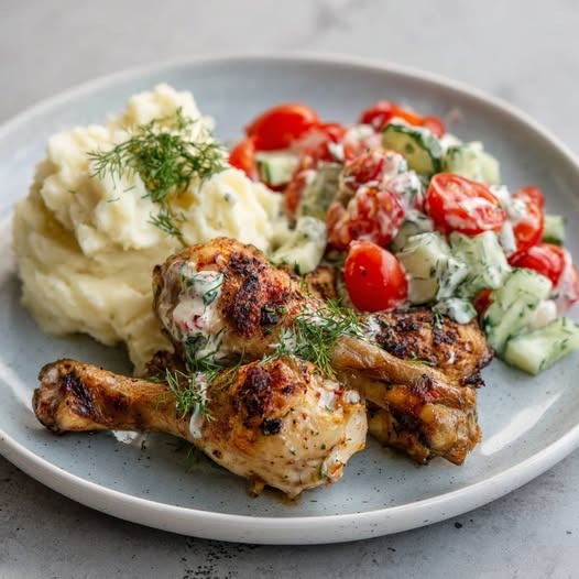 This meal brings together everything you love on one plate — juicy, golden-brown roasted chicken drumsticks bursting with flavor, velvety mashed potatoes that melt in your mouth, and a refreshing cucumber-tomato salad for balance. It’s simple, satisfying, and perfect for both weeknights and family dinners.