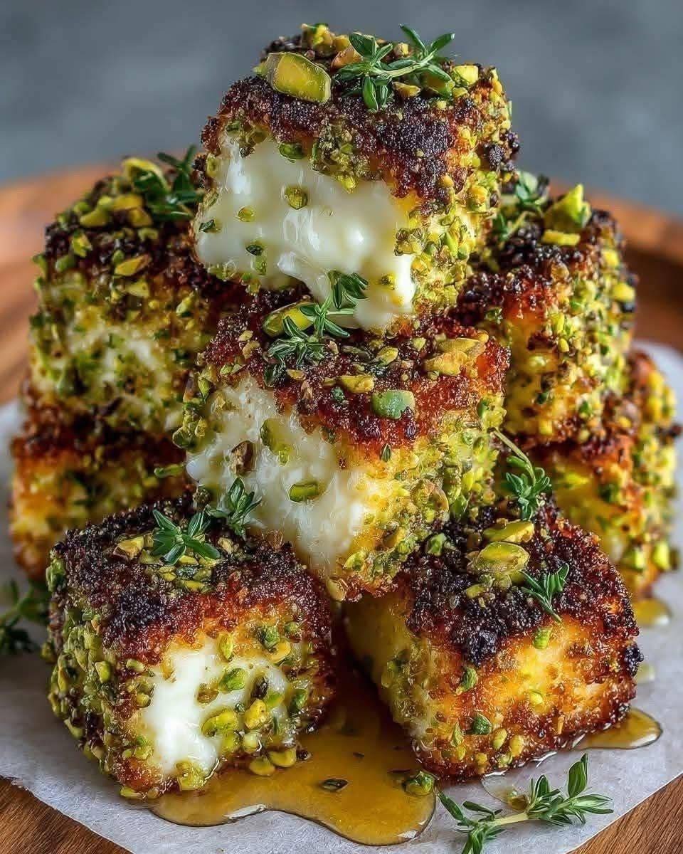 These elegant little appetizers are creamy, crunchy, and irresistibly rich. Each bite-sized piece of Brie is coated in a sweet-and-savory pistachio crust, creating the perfect balance between the soft, melty cheese and the nutty crunch. They’re ideal for parties, holiday gatherings, or as a quick gourmet snack that always impresses.