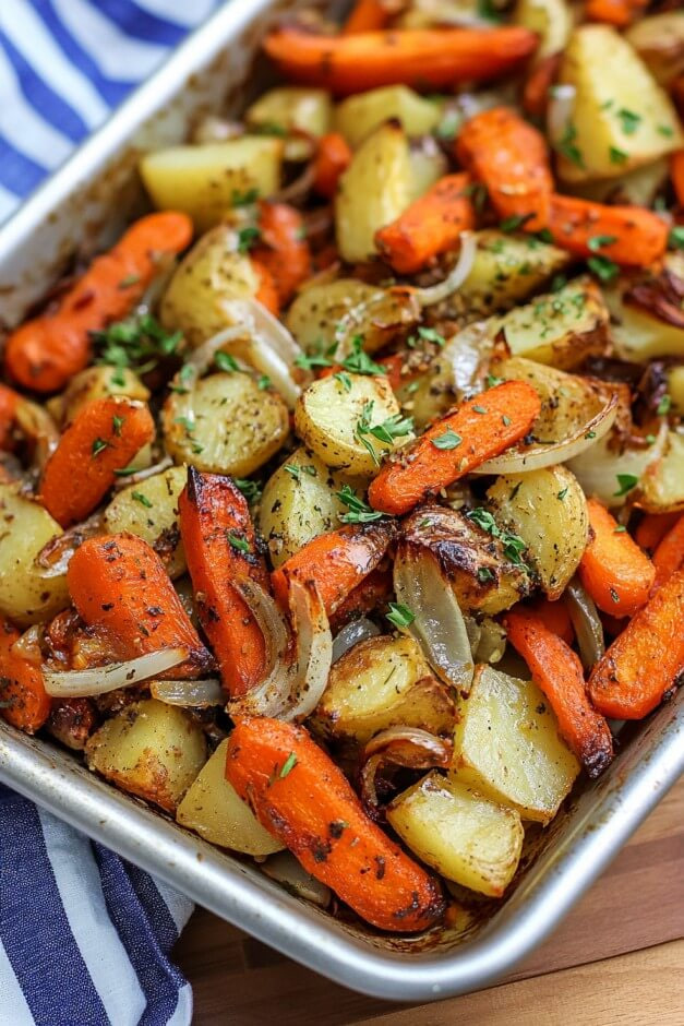 A classic sheet-pan side dish made with tender potatoes, sweet roasted carrots, and perfectly seasoned green beans. Everything roasts together until golden, lightly crisp, and full of flavor. It pairs well with chicken, steak, fish, or any weeknight dinner.