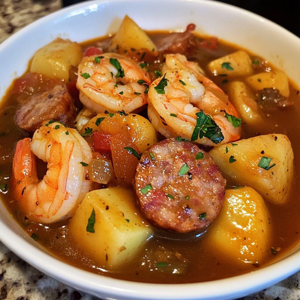 This stew is a rich, flavorful one-pot meal loaded with tender potatoes, smoky sausage, and juicy shrimp. It’s comforting, filling, and packed with Cajun-style flavor. The broth becomes buttery, slightly spicy, and infused with all the good stuff from the sausage and shrimp. It tastes like something between a seafood boil and a hearty Southern stew — simple ingredients, big flavor, and perfect for cold nights or big family dinners.