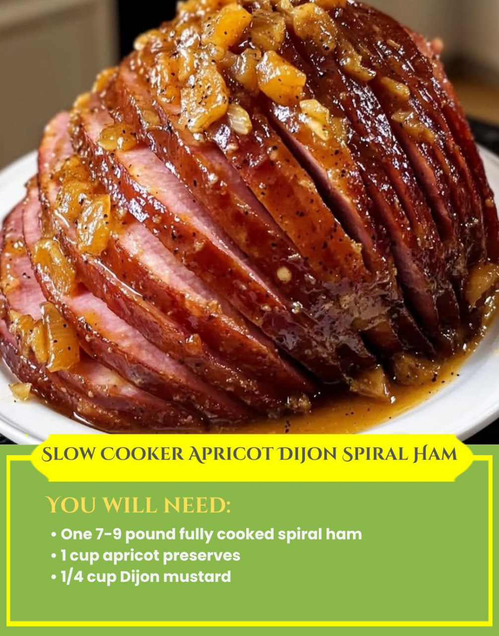 This slow-cooked ham is incredibly tender and coated in a sweet-tangy glaze made from apricot preserves and Dijon mustard. The glaze melts into every slice as it cooks, giving the ham a juicy texture and deep flavor with almost no effort. Perfect for holidays, gatherings, or a simple family dinner.