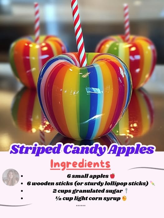 Crisp apples are dipped in a glossy candy coating, then decorated with bright stripes of chocolate or candy melts. They’re crunchy, sweet, and perfect for parties, fairs, or Halloween. The striped look makes them stand out from regular candy apples — and they’re easier to customize with colors to match any season or theme.
