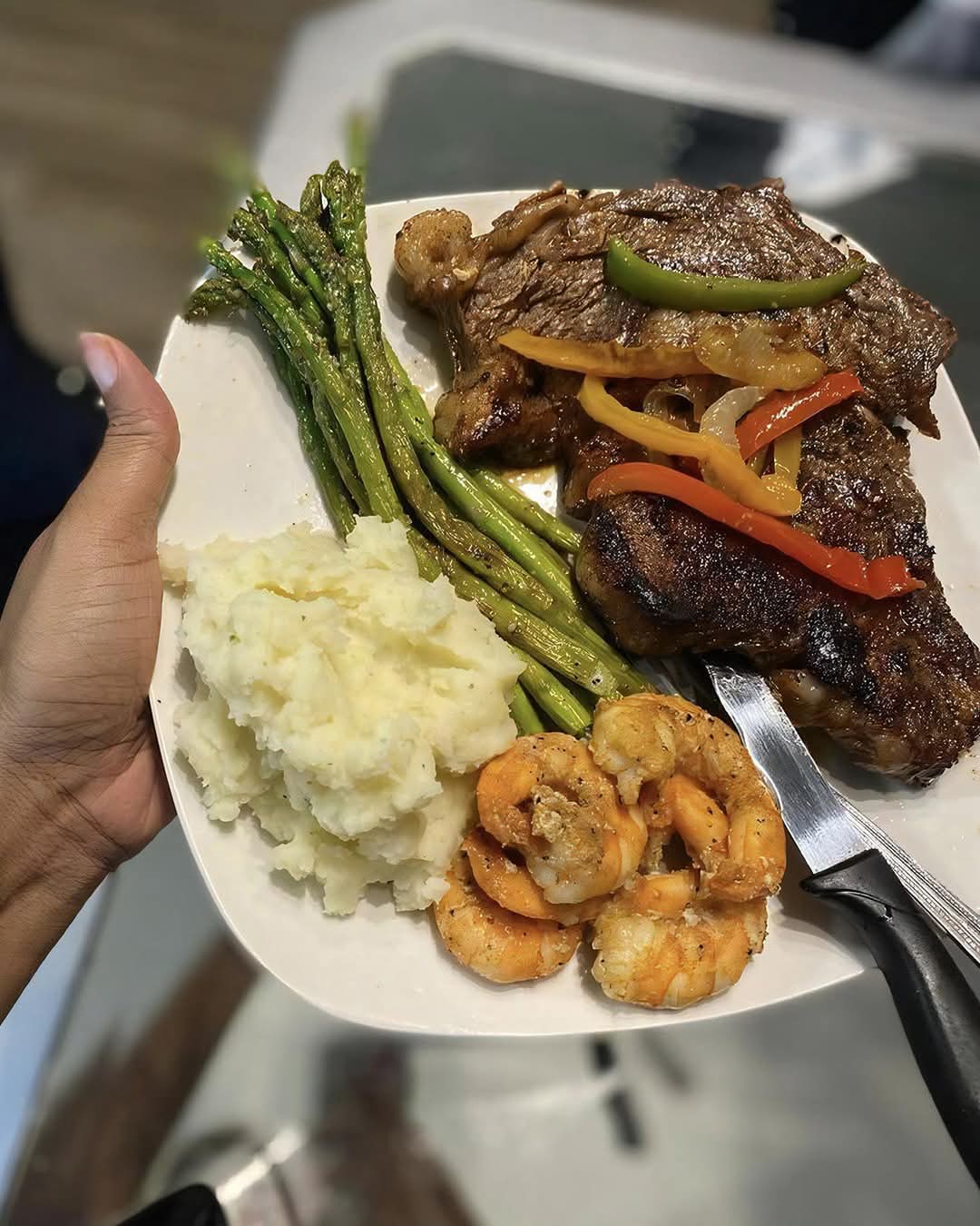 Surf & Turf Steak with Garlic Butter Shrimp, Mashed Potatoes & Roasted Asparagus